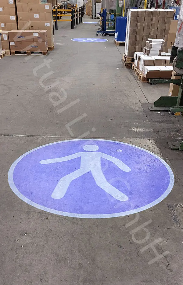 Flächenprojektoren geben Warn- und Hinweisschilder, Palettenstellplätze, Zebrastreifen oder jegliche Art von Wunschprojektionen aus, die sie uns vorgeben. Von Einfarbig bis hin zu Full-Color. Die benötigte Leistung ist abhängig von der Umgebungshelligkeit, der Bodenbeschaffenheit, der gewünschten Ausgabegröße, sowie der Ausgabefarbe. Die Ausgabegröße der Projektion kann mittels unterschiedlicher Linsen an verschiedene Installationshöhen angepasst werden. Die Ausgabeoptik, als auch die Linse unserer Flächenprojektoren können jederzeit getauscht werden.